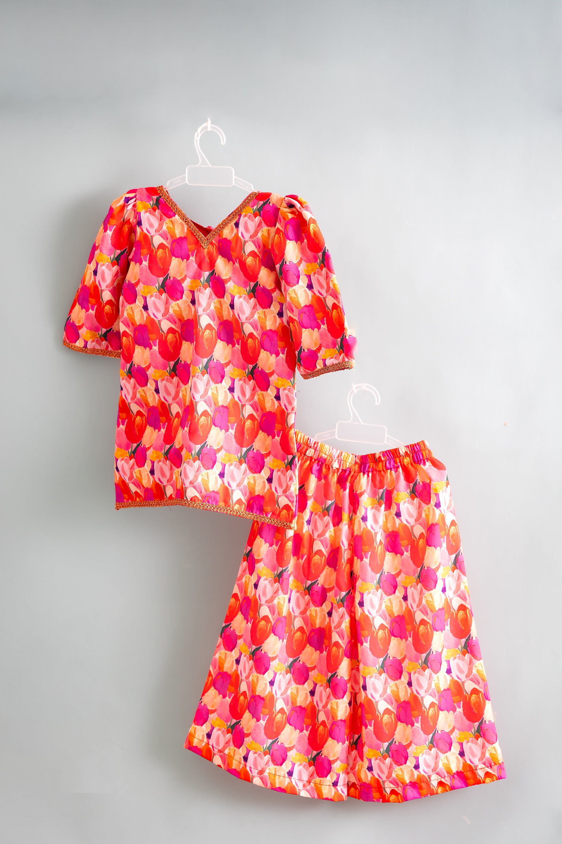 Make your little one look festive-ready in this charming Semi-Sarara Salwar Set, crafted from soft muslin fabric with a comfortable cotton lining. The flared semi-sarara pants paired with a beautifully designed top create an elegant look suitable for birthdays, family functions, and festive occasions. Lightweight, breathable, and easy to wear, this set ensures comfort without compromising on style. Available for girls aged 1 to 12 years, it’s a perfect addition to every little princess’s wardrobe.